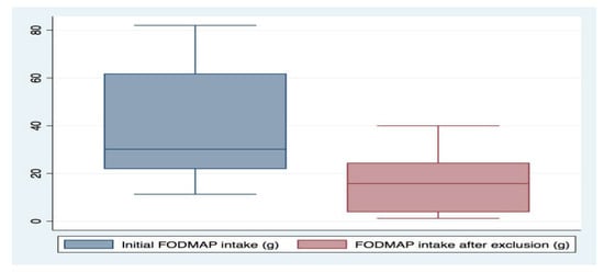 After the run-in diet, the mean FODMAP intake decreased from 40.1 g to 17.1 g (p = 0.14) (Figure 3 and Figure S3), and all were adherent to gluten exclusion based on the applied questionnaire [23].
