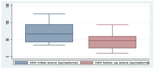 Mean symptom scores before (n = 10) and after (n = 8) the gluten-free, low-FODMAP diet (p = 0.087, Wilcoxon sign rank test). NDI—Nepean dyspepsia index.