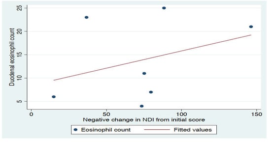 There was no significant association between the baseline eosinophil count and the magnitude of change in dyspeptic symptoms during the run-in diet period (p = 0.45, linear regression, Figure 5). Two participants reported worsening of constipation symptoms, and one worsening of bloating and constipation requiring cessation of the run-in diet.