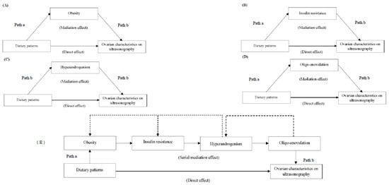 In the second stage of the analysis, regression-based simple mediation tests were used to examine whether the associations between dietary patterns and ovarian morphology could be explained through indirect effects (also known as mediation effects) by each of the mediator variables. The regression-based simple mediation framework is illustrated in Figure 1A–D.