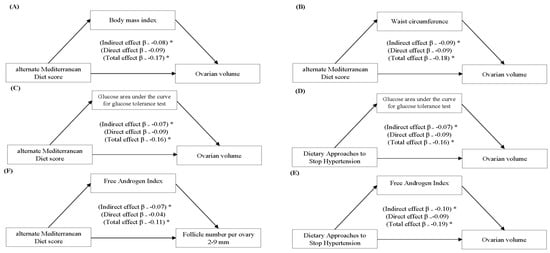 Simple mediation analyses demonstrating indirect associations between aMED and DASH scores and ovarian characteristics on ultrasonography for n = 109 women who provided optimal image quality with a reliable evaluation of ovarian volume (Panels A to E) and follicle numbers per ovary (Panel F). β is a standardized product of serial regression models on log-transformed variables. Standardized β can be interpreted as the expected standard deviation (SD) change in the OV and FNPO per 1 SD increase in dietary patterns through an individual mediator. Body mass index and waist circumference were designated as a proxy for obesity; glucose area under the 75 g oral glucose tolerance test curve for insulin resistance; and, free androgen index for hyperandrogenism based on the magnitude of the effect estimates in our statistical models shown in Supplementary Data 2 (Supplementary Tables S1 and S2). All models are adjusted for age, race, and total energy intake. An asterisk above the effect estimate denotes a significant effect estimate (p < 0.05).