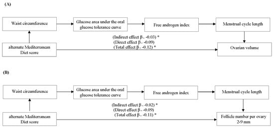Serial mediation analyses demonstrating indirect associations between aMED score and ovarian characteristics on ultrasonography for n = 109 women who provided optimal image quality with a reliable evaluation of ovarian volume (Panel A) and follicle number per ovary (Panel B). β is a standardized product of serial regression models on log-transformed variables. Standardized β can be interpreted as the expected standard deviation (SD) change in the OV and FNPO per 1 SD increase in dietary patterns through serial mediators. Waist circumference was selected as a proxy for obesity; total glucose area under the 75 g oral glucose tolerance test curve for insulin resistance; free androgen index for hyperandrogenism; and menstrual cycle length for oligo-anovulation based on the magnitude of the effect estimates demonstrated in our statistical models shown in Supplementary Data 2 (Supplementary Tables S1 and S2). All models are adjusted for age, race, and total energy intake. An asterisk above the effect estimate denotes a significant effect estimate (p < 0.05).