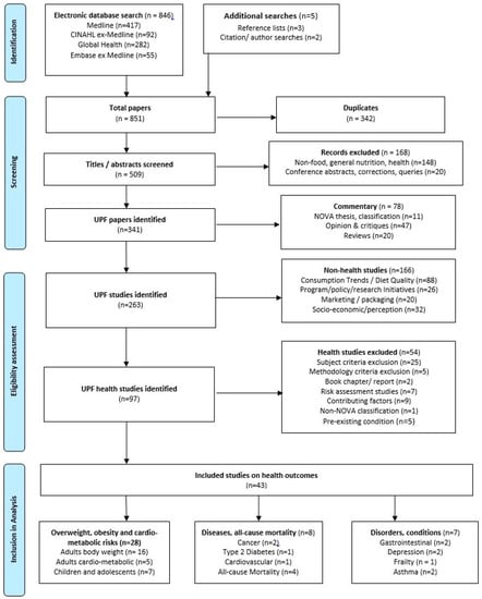 The study utilised a systematic search process to ensure relevant studies were retrieved. Searches were performed in July 2019 using four databases—Medline, CINAHL, Global Health and Embase—and searching string variations of the following keywords: (ultra-process* or ultra process* or ultraprocess*) or (NOVA and “food classification”). Google Scholar citation searches and manual searches of reference lists were also conducted to identify relevant studies. A further EBSCO-host combined search was undertaken to identify any literature reviews and meta-analyses potentially missed by the initial searches. Additional searches of the electronic databases were performed in February 2020 and of Medline on 21 May 2020, to identify studies published in the interim. Records were downloaded to EndNote X8.2, and duplicates removed. Titles were first screened by title and abstract, then by full text against the inclusion and exclusion criteria given in Table 1. Eligible articles were studies evaluating exposure (defined as ‘levels of consumption’) to ‘ultra-processed foods’ (defined as group 4 of the NOVA food classification system [21], described in Supplementary Material Table S1) and a ‘health outcome’ (defined as any disease, disorder or condition specified in the International Classification of Diseases, 11th Revision [45]). In this review, ‘food’ includes foods and beverages; ‘consumption’ includes national or household food availability and individual food intake. From a total of 851 papers, there were 263 identified studies on UPF and 43 for final inclusion in our review. Figure 1 presents a flow diagram adapted from PRISMA [43,44] of the search process.