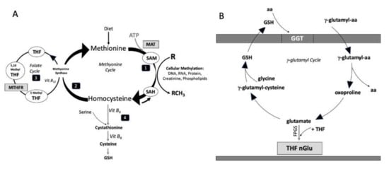 In (A): Interactions of methionine cycle, folate cycle, transsulfuration and methylation pathway. (1) Methionine is converted to S-adenosylmethionine (SAM) by methionine adenosyltransferase (MAT). SAM serves as methyl-donor in various cellular methylations; (2) the pathway of remethylation of Hcy to methionine by (3) folate cycle requires the presence of vitamin B12 as coenzyme of the methionine synthase reaction that transfers the one-carbon methyl group from 5-methyl-tetrahydrofolates (THF). MTHFR: methylene-tetrahydrofolate reductase; (4) in the transsulfuration pathway, Hcy reacts with serine to form cystathionine converted in cysteine with the reaction’s vitamin B6 dependent. Cysteine may be in turn be incorporated into glutathione. In (B): γ-glutamyl cycle. Glutamyl transpeptidase (GGT) transfers glutamyl aa from blood into cell where oxoproline and glutamate are formed. Thereafter folylpoly-γ-glutamate (FPGS), an ATP-dependent ligase, catalyzes the addition of a polyglutamate tail to reduced folates, one glutamate residue after the other.