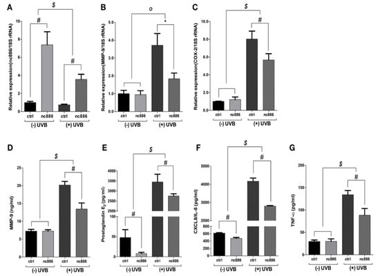 Effect of overexpression nc886 on the production of inflammation-related proteins increased by UVB. Cells were transfected with 1 µg of nc886 gene. Then, 48 h after transfection, the cells were irradiated with UVB (5 mJ/cm2). RNA samples were analyzed with quantitative real-time polymerase chain reaction (qRT-PCR) and the cell culture fluid with ELISA. Values measured for (A) nc886, (B) MMP-9, (C) COX-2 were indicated in a fold change compared to the control. The mRNA level was normalized with the expression of 18S rRNA. The measured values for (D) MMP-9, (E) PGE2, (F) IL-8, and (G) TNF-α were indicated in absolute concentration for each. * p < 0.05, # p < 0.01, compared to basal levels; o p < 0.05, $ p < 0.01, compared between (−) UVB and (+) UVB groups.