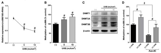 Analysis of the expression and methylation changes of nc886 in human keratinocytes exposed to ultraviolet light UVB. The cells were irradiated with UVB at 5 and 10 mJ/cm2. Total RNA and gDNA samples were collected 24 h after UVB irradiation, and protein samples were collected six hours after UVB irradiation. Samples were analyzed by (A,B,D) qRT-PCR, and (C) Western blot analysis. The nc886 mRNA level was normalized with 18S rRNA and the methylated-nc886 level was normalized with glyceraldehyde 3-phosphate dehydrogenase (GAPDH). The levels of expression were compared to the control for (A) nc886, illustrated in a fold change. A percentage compared to the control was used to indicate the levels for (B,D) methylation of nc886. # p < 0.01, compared to basal levels; $ p < 0.01, compared between (−) Aza-dC and (+) Aza-dC groups.