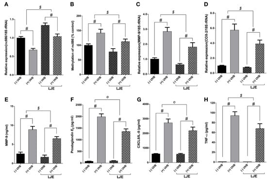 Effect of Laminaria japonica extract (LJE) on the production of inflammation-related proteins increased by UVB. The cells were treated with LJE at a concentration of 100 µg/mL for 48 h prior to UVB irradiation (5 mJ/cm2). After 24 h of irradiation, RNA, gDNA samples, and cell culture fluid were collected. mRNA and gDNA samples were analyzed with qRT-PCR. A fold change was used to compare nc886 (A expression and (B) methylation, (C) MMP-9, and (D) COX-2 to the control. The measured values for (E) MMP-9, (F) PGE2, (G) IL-8, and (H) TNF-α were indicated in an absolute concentration for each. * p < 0.05, # p < 0.01, compared to basal levels; o p < 0.05, $ p < 0.01, compared between (−) LJE and (+) LJE groups.