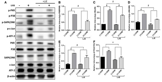 Effect of LJE on UVB-mediated MAPK signaling in keratinocytes. Keratinocytes were treated with LJE (100 µg/mL) for 48 h prior to UVB irradiation (5 mJ/cm2). Six hours after irradiation, the PKR phosphorylation and MAPK activation were analyzed with (A) Western blots, (B–F) the quantitative results are shown. * p < 0.05, # p < 0.01, compared to basal levels; o p < 0.05, $ p < 0.01, compared between (−) LJE and (+) LJE groups.