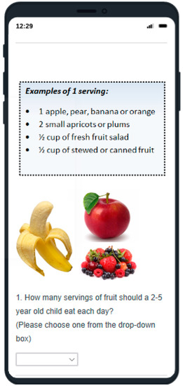 To ensure the questionnaire was at an appropriate level, testing concepts that seemed historically difficult to grasp were avoided, such as recommended daily intakes (RDI) [16,18,37]. Moreover, RDI may be phasing out from nutrition resources [34,38,39], so appeared less relevant. Examples of serving sizes were taken from nutrition guidelines [33,34] to standardise answers for the servings’ subcategory. Due to the increasing use of digital technologies in education [40], the questionnaire was in an online digital and visually appealing format that could be completed using a computer or smart mobile devices (e.g., tablets, smartphones) (Figure 1). Images were royalty-free or created by the primary author. Lunchbox food images were based on previous research [41]. To maximise data quality and increase response rates, the questionnaire favoured closed-questions (quantitative data); however, open-questions (qualitative) were included (e.g., “please specify”) to clarify answers [42]. However, for the knowledge items, qualitative data was only collected when asking if there were any other suitable drinks or snacks that are appropriate for preschoolers. Forced responses and request responses were used to minimise missing data; however, an option “choose not to answer” was provided. Items were coded numerically, with nutrition knowledge items being given a “+1” score for a correct answer and “0” for an incorrect, “choose not to answer” or “not sure” response. For the purpose of scoring, a qualitative response that was contradictory to nutrition guidelines was also scored as “0” for incorrect, while a response in alignment was scored “+1”. The sum of these answers provided total and subcategory knowledge scores. A copy of the questionnaire is available (see Supplementary File S1).