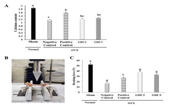 3.6. GD Collagen Increased the Calcium Content and Bone Strength of the Tibia in OVX Rats