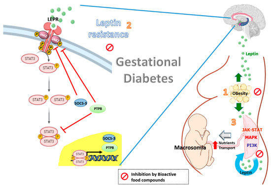 Gestational diabetes (GDM) is a hyperglycemic state that is recognized for the first time during pregnancy [1], and its pathophysiology is not fully clarified yet. GDM is one of the most common complications in pregnancy, affecting 3–8% of all pregnancies [2]. This prevalence has increased in recent decades (≥20% of pregnancies in some parts of the world), both in developed and developing countries, due to increased average age of pregnant women and increased obesity [3], one of the greatest public health challenges of the 21st century. Although the GDM phenotype is highly heterogeneous [4], half of its prevalence can be explained by overweight and obesity [5]. Indeed, obese women have an increased risk of GDM compared to women of normal weight [4]. Moreover, in women with GDM, pre-pregnancy obesity, excessive gestational weight gain and poor glycemic control are also linked with others pregnancy complications, such as gestational hypertension and preeclampsia [6]. It has even been reported that excessive gestational weight gain was the variable with the greatest effect on the probability of a newborn with macrosomia (a conditions associated with an increased risk of perinatal mortality and neonatal morbidity). GDM also increases, in turn, the risk, in both mother and offspring, of developing type 2 diabetes, metabolic syndrome and obesity [7,8]. Therefore, obesity during pregnancy is an important risk factor for adverse health outcomes both in the mother and offspring, and imposes substantial economic burdens. Therefore, prevention of obesity would be directly related to a lower risk of GDM. Impaired glucose homeostasis in GDM is also related to higher production of reactive oxygen species (ROS), consequently depleting the anti-oxidative status. This is why, to restrain the spread of epidemic excess weight, women must receive a comprehensive intervention before, during, and after pregnancy. Lifestyle changes, including nutrition initiated during early pregnancy, have been unsuccessful overall in preventing GDM in at-risk obese women [9]. Now, there is a consensus regarding the need for effective interventions targeting obesity and lifestyle that reduce the metabolic burden earlier in life, well before motherhood, and it underlines that such interventions may benefit both the mother and the future offspring. Although energy restriction leading to weight loss is a successful dietary intervention for improving obesity-associated metabolic disorders, other dietary interventions, such as those leading to a reduction in adipose tissue inflammation regardless of weight loss, have not been explored in detail. In this sense, leptin, produced by adipocytes, is a key regulator of appetite and is present in elevated concentrations in obesity [10]. Therefore, new research into nutritional mechanisms that restore leptin metabolism and signals of energy homeostasis may inspire new treatment options for obesity-related disorders such as GDM. In this review, we wanted to address the current insights and emerging concepts on potentially valuable nutrients and food components to modulate leptin metabolism. Moreover, obesity is associated with a chronic low-grade inflammation in the adipose tissue [11], and several dietary food components, such as phenols, peptides, and vitamins, are able to decrease the grade of inflammation and improve leptin sensitivity by up- or down-regulation of leptin-related genes. Others food components, such as saturated fatty acids should be avoided, since they may worsen chronic inflammation, subsequently increasing the risk for pathological complications. Finally, given the crucial role that the placenta plays in mediating pregnancy outcomes, it is important to consider the impact of micronutrient supplementation on the mechanisms associated with placental function, as well as maternal and fetal homeostasis.