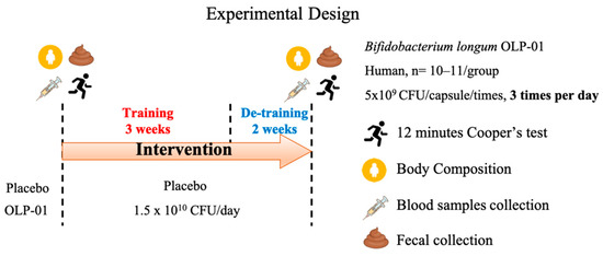 B. longum OLP-01 was isolated from a weightlifting gold medalist. In previous studies, it was found to significantly increase muscle strength and endurance exercise performance and to reduce the fatigue index of untrained or trained mice [28,29]. Therefore, in the current study, we combined OLP-01 with three weeks of regular training and two weeks of de-training for middle- and long-distance runners at the National Taiwan Sports University to explore of the effects of OLP-01 supplementation on endurance exercise performance and physiological adaptation.
