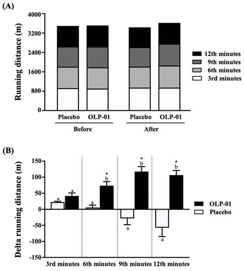 Effects of OLP-01 supplementation combined with three weeks of regular training and two weeks of de-training on (A) running distance and (B) change in running distance. Data are presented as mean ± SD. Different superscript letters (a, b) indicate significant difference at p < 0.05, and pre- and post-administration effects were statistically analyzed using a paired Student’s t-test, * p < 0.05, at each time point (3rd, 6th, 9th, and 12th min).