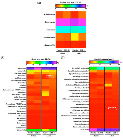 At the Genus level (Figure 3B), no significant differences between placebo and OLP-01 groups existed before the experimental intervention. After five weeks of supplementation with OLP-01, Bifidobacterium was significantly richer in the OLP-01 group than in the control group (p = 0.0027). Especially, the Lactobacillus count also increased nine-fold after supplementation with OLP-01.