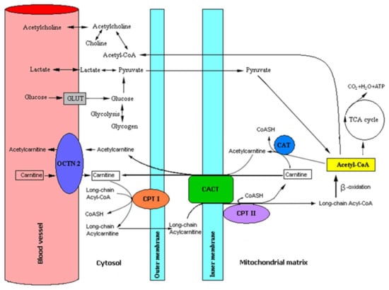 In the homeostasis of carnitine and its ester, the main role in the maintenance of appropriate concentrations is played by the kidneys [64]. Carnitine is not metabolized in humans but undergoes filtration in the glomeruli and is almost totally (98–99%) reabsorbed in the renal canaliculi. Sodium-dependent carnitine organic cation transporter (OCTN2) plays a key role in renal carnitine reabsorption [65]. The renal threshold for free carnitine is in the range of its physiological plasma concentration.