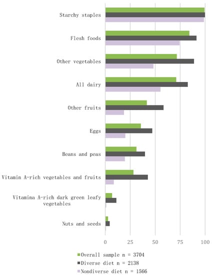 The respondents consumed foods from a range of 1–9 groups with 42.3% of the sample (1566) consuming from 1 to 4 food groups (i.e., non-diverse diet), 30.4% (1127) consuming from five groups (i.e., acceptable diverse diet), and 27.3% (1011) consuming more than five groups (i.e., highly diverse diet). Figure 1 shows the percentage of participants with a diverse and non-diverse diet according to the food groups analyzed (Table 1), which were ranked based on their preference in the study sample. The food groups that were consumed by more than 50% of the participants were starchy staples (99.4%), meat (84.2%), other vegetables (71.7%), and dairy products (71.0%). Less than 50% of the participants reported intake of fruits (41.6%), eggs (35.6%), pulses (31.2%), and vitamin A-rich vegetables and fruits (28.2%). The lowest consumption was for green leafy vegetables (6.8%) and nuts and seeds (2.8%).