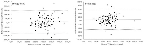 The observed Pearson’s correlation coefficients for nutrients are very similar to those of FFQ validation studies conducted in older adults that also used multiple 24-hour dietary recalls as the reference method [19,20]. For example, their coefficients for energy, protein, fat, calcium, and fiber, respectively, ranged from 0.22 to 0.39, 0.30 to 0.41, 0.25 to 0.58, 0.38 to 0.54, and 0.29 to 0.50. FFQ validation studies in older adults using multiple dietary records as the reference method also showed similar results (0.19–0.40, 0.19–0.45, −0.01–0.47, 0.35–0.49, 0.49–0.55) [21,22,23,24]. For food groups, a Spanish study conducted in adults aged 55–80 years and using three-day dietary records as the reference method, reported higher correlation coefficients for meat (0.61), fish (0.42), fruit (0.57), and vegetables (0.70) compared to the current study, which could potentially be explained by their much higher intakes of these food groups [24]. Overall, these comparisons show that the validity of the FFQ is fairly similar to that of FFQs used for older adults from other countries.