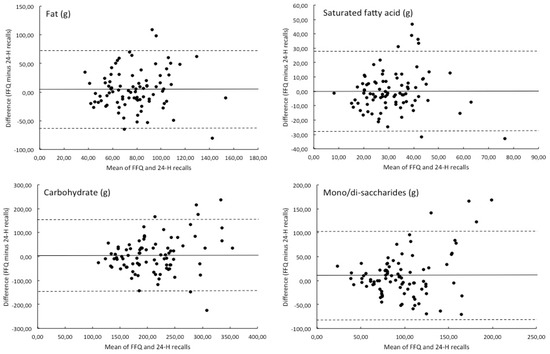 Using the Bland–Altman method, the level of discrepancy was estimated with 95% confidence intervals of agreement for the intake of energy and macronutrients only (Figure 1). The mean difference in intake between the FFQ and the three 24-hour dietary recalls (with 95% confidence interval) was 76 (−1255;1408) for energy (kcal), 3.6 (−47.6;54.8) for total protein (g), 4.9 (−62.7;72.5) for total fat (g), −0.1 (−27.9;27.7) for saturated fatty acids (g), 4.7 (−145.9;155.3) for total carbohydrates (g), and 10.3 (−82.5;103.1) for mono/di-saccharides (g). Based on visual inspection of the Bland–Altman plots, there was no indication for an increase or decrease in the intake difference between the two methods with higher mean intake values.