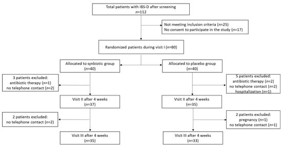 During the first visit (visit I), all eligible patients were assessed by a physician with the use of IBS-SSS questionnaire and were allocated according to a computer-generated blocked list with a block size of 2 to the synbiotic (patients receiving a synbiotic preparation) or placebo group. The block size was not disclosed to the investigators, and the allocation was blinded to both patients and investigators. Patients received one sachet with the synbiotic preparation or an identical appearing and tasting placebo (maltodextrin) 2 times a day over an 8-week period. The contents of sachets were ingested after being dissolved in 100 mL of water. Patients reported to a physician every 4 weeks (visit II and visit III) in order to receive a synbiotic preparation or placebo for the next 4 weeks (visit II) and to be clinically assessed.