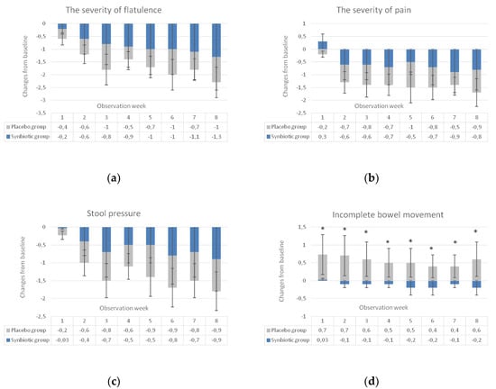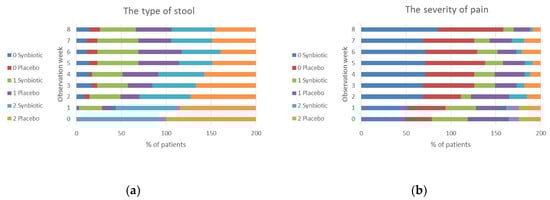 A significant amelioration after the synbiotic treatment in comparison to placebo was also observed when nominal values presented as arithmetical means ± SD (Figure A1). A statistically significant improvement in the synbiotic group was observed for the stool type (evaluated in the Bristol stool scale), the severity of pain and the feeling of incomplete bowel movements, respectively in the 5th, 7th and 2nd week of observation.
