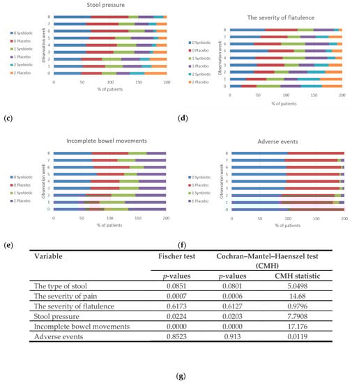 The impact of synbiotics on (a) the type of stool, (b) the severity of pain, (c) stool pressure, (d) the severity of flatulence, (e) incomplete bowel movements, (f) adverse events assessed by telephone interviewers. All data were collected during telephone interviews. Week 0—screening week before enrollment into the study (baseline). Results are presented as a percentage of patients who reported the severity of symptoms accordingly transformed into new scales described in Table 2. The table (g) presents p-values of a Fisher exact test and Cochran–Mantel–Haenszel test (CHM) and CHM statistic. 0 Synbiotic/0 Placebo—constipation, no or weak pain, flatulence and stool pressure, no feeling of incomplete bowel movements, no adverse events in the synbiotic/placebo group; 1 Synbiotic/1 Placebo—normal stool, intermediate pain, flatulence and stool pressure, presence of a feeling of incomplete bowel movements, presence of adverse events in the synbiotic/placebo group; 2 Synbiotic/2 Placebo—diarrhea, severe pain, flatulence and stool pressure in the synbiotic/placebo group.