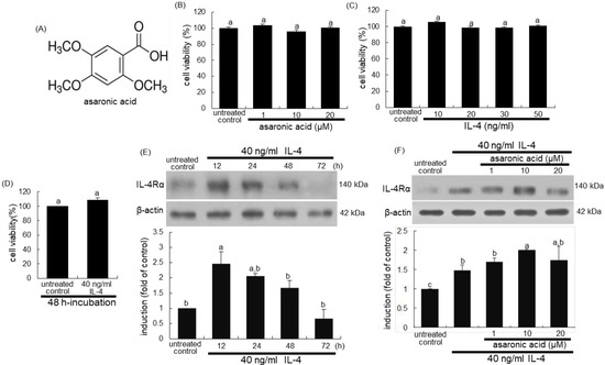 Chemical structure of asaronic acid (A), cytotoxicity of asaronic acid and IL-4 for up to 48 h (B–D), time-course response of IL-4 receptor IL-4Rα induction to IL-4 for up to 72 h (E), and further upregulation of IL-4Rα by asaronic acid (F). J774A.1 macrophages were exposed to 10-50 ng/mL IL-4 in the absence and presence of 1-20 μM asaronic acid for up to 72 h. Macrophage viability (mean ± SEM, n = 5) was measured by using 3-(4,5-Dimethylthiazol-2-yl)-2,5-diphenyltetrazolium bromide (MTT) assay and expressed as percent cell survival relative to untreated control (B–D). Cell lysates were subject to 8% SDS-PAGE and Western blot analysis with a primary antibody against IL-4Rα. β-Actin antibody was used as an internal control. The bar graphs (mean ± SEM, n = 3) in the panels represent quantitative results of the upper blot bands obtained from a densitometer. Mean values in respective bar graphs not sharing a same lower-case alphabet letter are significantly different at p < 0.05.