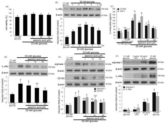 Cell viability of asaronic acid (A), temporal response of IL-4Rα induction to glucose (B), inhibition of IL-4 secretion and induction of IL-4Rα, arginase-1, and CD163 by asaronic acid (C–E) and induction of arginase-1 and IL-4Rα by 5.5 mM glucose, 2 μg/mL LPS, 40 ng/mL IL-4, and 33 mM glucose (F). J774A.1 macrophages were exposed to 33 mM glucose in the absence and presence of 1–20 μM asaronic acid for up to 5 days. THP-1 monocytes were differentiated to macrophages with PMA for 5 days and then exposed to 5.5 mM or 33 mM glucose in the absence and presence of 1-20 μM asaronic acid for 48 h. Macrophage viability (mean ± SEM, n = 5) was measured by using MTT assay and expressed as percent cell survival relative to untreated control (A). For the measurements of IL-4 secretion, IL-4 in cell culture media was detected by using an ELISA kit (C). J774A.1 macrophages were incubated in a media containing 5.5 mM glucose, 2 μg/mL LPS, 40 ng/mL IL-4, and 33 mM glucose for 48 h (F). Cell lysates were subject to 8–12% SDS-PAGE and Western blot analysis with a primary antibody against IL-4Rα, arginase-1, and CD163 (B,D–F). β-Actin antibody was used as an internal control. The bar graphs (mean ± SEM, n = 3) in the panels represent quantitative results of the upper blot bands obtained from a densitometer. Mean values in respective bar graphs not sharing a same lower-case alphabet letter are significantly different at p < 0.05.