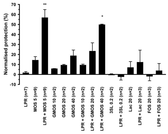 Lactose is the core disaccharide (Galβ4Glc) at the base of most of the structures identified in MOS and GMOS, hence we included lactose in our functional tests. Lactose at a concentration as high as 20 mg/mL, either alone or in the presence of LPR, did not protect. When 0.2 mg/mL 3′SL (the approximate concentration present in MOS at 5 mg/mL) was tested in the absence or presence of LPR, no protection was seen. However, at the much higher concentration of 10 mg/mL, 3′SL in combination with LPR gave significant protection (data not shown).