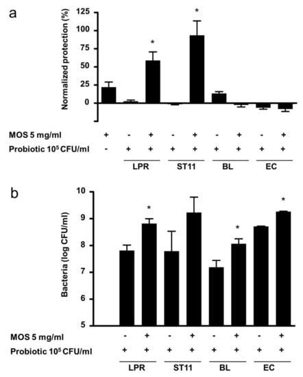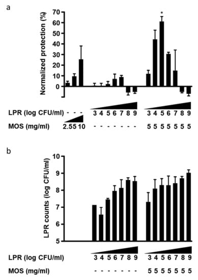 First, we tested whether viable LPR was necessary in order to exert its positive effect with MOS. Neither the combination of MOS with heat-inactivated LPR, nor of MOS with LPR incubated in the presence of the antibiotics penicillin and streptomycin, gave protection, compared to the synbiotic of MOS with live LPR (Figure 5a). Thus, viable LPR is required for protection.