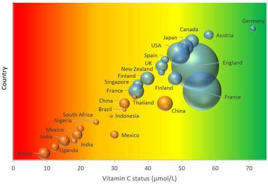 Global vitamin C status and prevalence of insufficiency has never been fully reported, despite increasing concern over micronutrient malnutrition in low-middle income countries (LMICs) resulting in poor health and higher rates of morbidity and mortality [13,14]. Here we provide an overview of global vitamin C status and prevalence of insufficiency and the associated potential public health impact of deficiency.