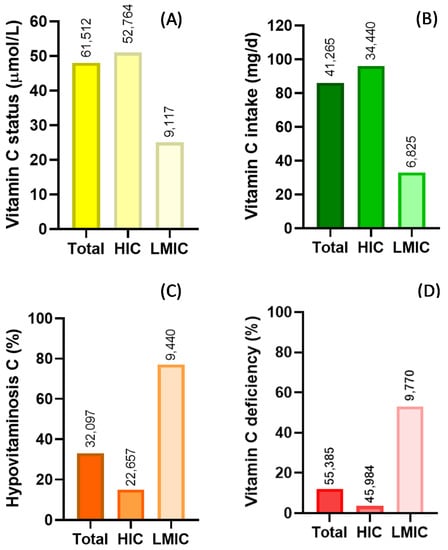 Summary of global vitamin C status (A) and intake (B) and prevalence of hypovitaminosis C (C) and vitamin C deficiency (D). Key: HIC—high-income countries; LMIC—low- and middle-income countries. Hypovitaminosis C, <23 µmol/L; vitamin C deficiency, <11 µmol/L. Numbers above bars indicate total number of individuals assessed.
