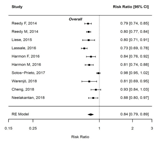 Of the three studies evaluating an association between a PBDP and cancer mortality, there were two cohort studies considering an MD score and breast cancer mortality [55,59]. The intervention study was not considered for the meta-analysis due to its different nature. Pooled estimates for the 2849 breast cancer patients revealed that adherence to the MD (high vs. low) was not associated with all-cause mortality among breast cancer survivors (RR = 0.87; 95% CI: 0.85–1.01). While heterogeneity between the studies was not apparent (I2 = 0%, p = 1), the study by Karavisouglou contributed with a small number of breast cancer patients, whose diagnoses were not confirmed [59]. Moreover, in this study, breast and gynecological cancers were considered together, thus biasing the pooled analyses to some extent. The other two studies provided more robust results [55,57], and supported that a PBDP from breast cancer onset reduces all-cause or breast cancer mortality.