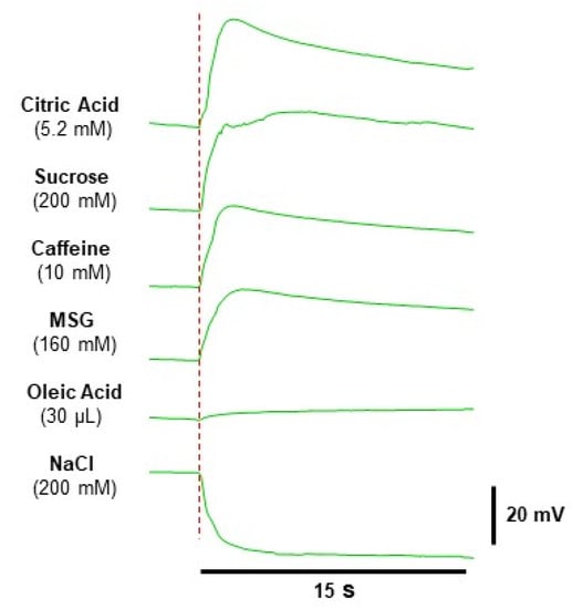 As noted above, the negative potentials we observed in response to NaCl stand in contrast to those of all other taste stimuli (which showed positive potentials). Although the taste bud cells involved in the salty taste transduction have not been conclusively identified [,], salty is the only taste quality known to be transduced by some Type I cells, which may exhibit depolarizing ionic currents due to direct Na+ permeation through membrane ion channels []. However, we cannot exclude that the salty stimulus may undergo an ionic dissociation directly recorded by the measuring electrode, thus superposing with the bio-signal itself. Future studies will cast a light on this issue.