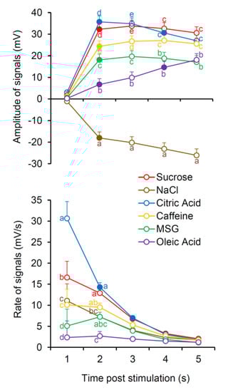 The quickest potential changes were recorded at 0.1 s in response to citric acid (p < 0.0001; Fisher LDS), then the values rapidly decreased across the time course of electrophysiological recordings, being halved at 2.5 s (p < 0.0001; Fisher LDS) and halved again at 5 s (p = 0.0011; Fisher LDS). Slower potential changes were determined at 0.1 s in response to sucrose (p < 0.0001; Fisher LDS), which significantly decreased only at 5 s (p ≤ 0.0047; Fisher). NaCl and caffeine produced intermediate values of potential change rate, which did not vary with time (p ≤ 0.021; Fisher LDS). The lowest values, unchanged over time, were observed with MSG and oleic acid (p ≤ 0.026; Fisher LDS).