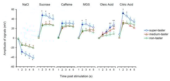 Differences in type of taste cells activated and in transduction mechanisms across taste qualities might explain these differences. Sweet, bitter, umami, and fat stimuli directly activate type II cells, which express specific receptors and, via ATP released during their tastant-induced stimulation, indirectly activate the adjacent type III cells, which instead directly respond to sour stimuli [,]. As mentioned above, our results showed that sucrose, citric acid, caffeine, MSG, and oleic acid evoked specific positive potential changes. Sucrose and citric acid generated the largest hyperpolarization mostly in the first part of the recordings. However, the responses to these two stimuli differed in their last portion; for citric acid, signal amplitude decreased significantly after 10 s, while for sucrose it did not change until the end of the stimulation. The responses to these two stimuli also differed for the hyperpolarization rate. For citric acid, the hyperpolarization arose very quickly, while for sucrose it was slower, with values that were half those evoked by citric acid. Caffeine and MSG evoked signals with intermediate amplitudes in the first part of the recordings, but afterward the signal amplitude distinguished the response to these two stimuli. Differences in the hyperpolarization rate also allowed us to distinguish the electrophysiological responses to these two stimuli; intermediate values were found in response to caffeine, while very slow signals were recorded in response to MSG. Finally, we recorded the lowest and slowest hyperpolarization in the responses to oleic acid, in which the signal amplitude reached values comparable to those of other stimuli only at the end of stimulation. This slow electrophysiological activation in response to oleic acid, which has been already observed in our previous work [], could depend on the high surface tension of this molecule that determines its slow diffusion toward the cell that detects it. The steep-onset hyperpolarization evoked by citric acid (which was particularly evident in super-tasters who have a high density of papillae), compared to that elicited by other stimuli (sucrose, caffeine MGS, oleic acid) may be explained by differences in the transduction mechanisms across stimuli []. Organic acids permeate through the membrane, acidify the cytoplasm and intracellular H+, by blocking a proton-sensitive K+ channel, and depolarize the cell membrane. On the other hand, the transduction mechanisms of sucrose, caffeine, MGS, or oleic acid are mediated by GPCRs, causing activation and diffusion of second messengers, which need more time to depolarize the cell.