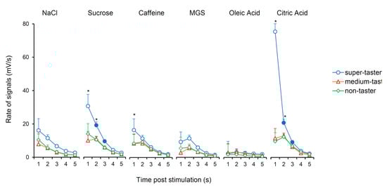 Time course of potential change rate (mV/s) of bioelectrical signals in response to taste stimulation with six taste qualities according to PROP taster status. Data (mean values ± SEM) determined after 0.1, 2.5, 5, 10, and 15 s after application of taste stimulation. n = 10 super-tasters, n = 15 medium tasters, and n = 14 non-tasters. Numbers 1, 2, 3, 4, 5 on the X-axis correspond to 0.1, 2.5, 5, 10, 15 s after stimulation, respectively. Solid symbol indicates significant difference with respect to the previous value of the corresponding group (p ≤ 0.0099; Fisher LDS, subsequent to repeated-measures ANOVA). * Indicates a significant difference with respects to the corresponding values of other taster groups (p ≤ 0.0427; Fisher LDS, subsequent to repeated-measures ANOVA).
