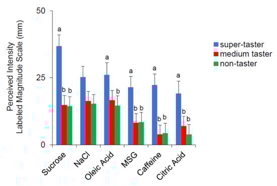 Perceived intensity rating for the six taste qualities in super-tasters (n = 10), medium tasters (n = 15), and non-tasters (n = 14). Different letters indicate a significant difference (p ≤ 0.0436; Fisher LDS, subsequent to repeated-measures ANOVA).