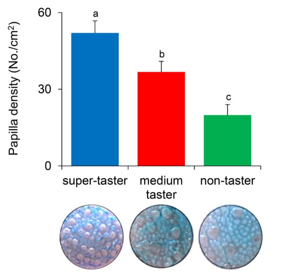 Density of fungiform papillae in super-tasters (n = 10), medium tasters (n = 15), and non-tasters (n = 14). Different letters indicate a significant difference (p ≤ 0.021; Fisher LDS test subsequent one-way ANOVA). Images of the stained area (6 mm dia.) of the tongue where the fungiform papillae were counted in a representative super-taster, medium taster, and non-taster are also shown.