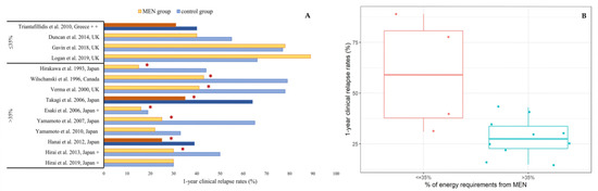 Out of the 14 studies which had a comparator group and reported the amount of MEN used, 10/14 (71%) used MEN covering >35% of patients’ daily energy requirements and 4/14 (29%) used MEN covering ≤35% (Figure 1). Consumption of >35% MEN was associated with significantly lower relapse rates compared to the control group, in 8/10 (80%) studies. Conversely, in all four studies using ≤35% MEN, there was no additional benefit of MEN use in reducing clinical relapse. Median (Q1, Q3) 1-year clinical relapse rates were 28% (21, 37) amongst patients consuming >35% MEN and 59% (33, 86) in patients consuming ≤35% MEN (Figure 1). In a retrospective, pediatric study, which did not report relapse rates, patients consuming 50% MEN had similar duration of clinical remission compared to those who did not consume MEN [63].