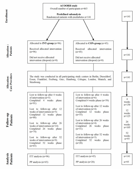 In the present subanalysis, which focuses on the prediabetes cohort of the ACCORH study, the primary outcome is the prediabetes conversion rate to normoglycemia (defined as HbA1c <5.7% [<39 mmol/mol]) between both groups after 52 weeks. Secondary outcomes are on differences in weight change following the intervention after 12 and 52 weeks. Tertiary outcomes focused on within-group changes from baseline to week 12 and 52 regarding BMI, fat mass, lean body mass, WC, FBG, fasting blood insulin, HbA1c, triglycerides, systolic and diastolic blood pressure, total cholesterol, and HDL-C and LDL-C. These parameters were analysed using mixed models adjusting for repeated measurements, baseline values, and multiple testing. Non-parametric data were analysed with Mann–Whitney U, Wilcoxon, and Friedman test, and parametric data with Student’s t-test, paired t-test, and analysis of variance with repeated measures to determine differences between groups following the intervention. Multivariable univariate regression analyses were carried out to investigate group differences while adjusting for baseline parameters. Dichotomous variables as well frequencies were compared by Fishers exact test, McNemar test, or Cochrane Q test. All statistical tests were two-sided, and the level of significance was set at α = 0.05. p-values were adjusted for multiple comparisons using Bonferroni correction. All analyses were performed using SPSS 22.0 (SPSS Inc., Chicago, IL, USA) and GraphPad Prism 6.04 (GraphPad Software, San Diego, CA, USA). The statistical analysis was performed by an independent institute not involved in the study conductance (ACOMED statistik®, Leipzig, Germany).