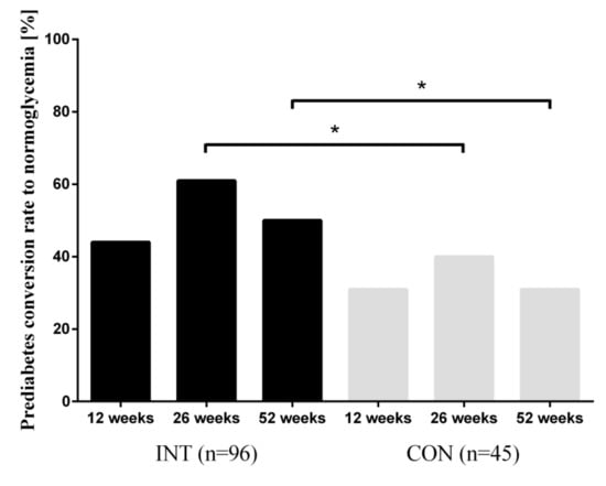 Compared with CON, significantly more participants of INT converted to normoglycemia after 52 weeks (50% vs. 31%; p < 0.05) in the ITT analysis, as shown in Figure 2. Furthermore, a significant difference could already have been shown at the 26-week follow-up (60% vs. 40%; p < 0.05) in the ITT analysis. As a consequence, the risk reduction led to a number-needed-to-treat of 5.3 for the INT-group after 52 weeks of intervention. The reduction in HbA1c was independent of weight loss.