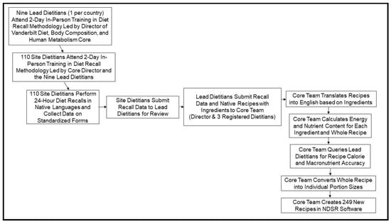 Dietary intakes were assessed during a 12-week period using the U.S. Department of Agriculture (USDA) five-step multi-pass 24-h diet recall methodology [13,14,15,16]. Prior to data collection, diet recall method was standardized across the nine countries by training of an extensive dietitian network led by the Vanderbilt Diet, Body Composition and Human Metabolism Core (Core). Two in-depth weekend-long in-person training workshops were convened; first with the nine lead dietitians who were selected to represent each participating country and then with the 110 site dietitians who were trained to administer diet recalls directly to all subjects within their study site in their native languages (Figure 1). Prior to initiating diet recall interviews, the site dietitians familiarized enrolled subjects with estimating portion sizes using standard measuring utensils (plates, cups, bowls and spoons of various sizes). Site dietitians then acquired diet recall data by phone on two weekdays and one weekend day that were unannounced, randomly selected, and nonconsecutive. Site dietitians transmitted all diet recall data electronically to their respective country’s lead dietitian who was responsible for assuring uniform data collection procedures, completeness of recall details, and identifying region-specific or homemade food items that would likely be unfamiliar to the Core dietitians. The lead dietitians provided recipes with lists of ingredients for the region-specific and homemade food items to the Core dietitians who converted these 249 recipes into English language recipes based on the individual food ingredients, energy and macronutrient contents, and portion sizes using the USDA National Nutrient Database for Standard Reference [17]. All recipe ingredient energy and nutrient data were confirmed with the nine lead dietitians prior to entry into the Core’s Nutrition Data System for Research software database (NDSR version 2014, Nutrition Coordination Center, University of Minnesota). This process allowed inclusion of all food and beverage items from all 1833 24-hr diet recalls, including the regional/ethnic/cultural–specific items, into NDSR, NDSR output files, and the statistical analyses.
