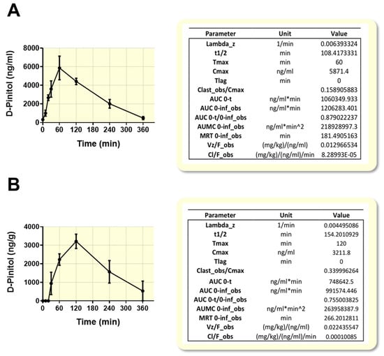 Concentration of D-Pinitol in (A) plasma (ng/mL) and (B) liver tissue (ng/g), after oral load (dose: 100 mg/kg) at different times. The values are means ± SEM (5 animals per treated group, Wistar male rats). Lambda_z: first order rate constant associated with the terminal (log-linear) portion of the curve were estimated by linear regression of time vs. log concentration. t1/2: half-life. Tmax: time of maximum observed concentration. For non-steady-state data, the entire curve is considered. For steady-state data, Tmax corresponds to points collected during a dosing interval. If the maximum observed concentration is not unique, then the first maximum is used. Cmax: maximum observed concentration, occurring at Tmax. If not unique, then the first maximum is used. Tlag: extravascular input (model 200) only. Tlag is the time prior to the first measurable (non-zero) concentration. Cl: clearance. Clast_obs: total body clearance for extravascular administration. AUC: area under the curve. AUMC 0-inf_obs: area under the first moment curve (AUMC) extrapolated to infinity, based on the last observed concentration. MRT: mean residence time. Vz: Volume of distribution.