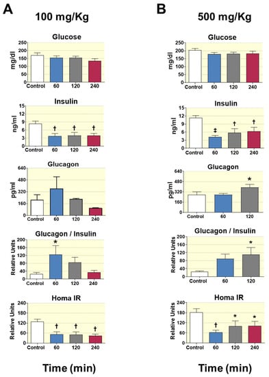 Effect of D-Pinitol on glucose, insulin and glucagon levels; on glucagon/insulin ratio and on insulin resistance index (Homa IR), at different times after administration. (A) Dose: 100 mg/Kg, (B) Dose: 500 mg/Kg. Values measured in plasma of Wistar male rats. The values are means ± SEM, 4–5 animals per group. Differences between groups were evaluated using one-way Anova + Fisher’s LSD test: * p < 0.05, † p < 0.01, ‡ p < 0.001 vs. Control group.