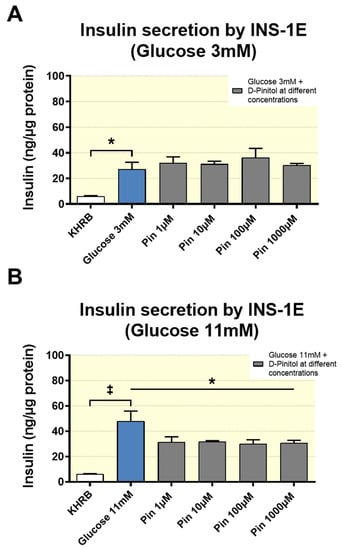 Effect of increasing concentrations of D-Pinitol (1 µM, 10 µM, 100 µM and 1000 µM) on insulin secretion by INS-1 cells under two glucose concentration conditions: (A) 3 mM glucose medium, (B) 11 mM glucose medium. Control groups shown in both conditions are represented by cell cultures treated with glucose-free Krebs–Ringer Bicarbonate HEPES medium (KRBH). The values are means ± SEM, 3 samples per treated group. Differences between groups were evaluated using one-way Anova + Fisher’s LSD test: (A): * p < 0.05 vs. KHRB medium group, (B): * p < 0.05 vs. 11 mM glucose medium group, ‡ p < 0.001 vs. KHRB medium group.