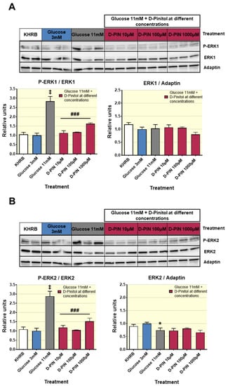 Western blot analysis of the phosphorylation status of the enzymes ERK1 and ERK2 from cell lysates of INS-1 cells treated with 3 mM glucose medium and with 11 mM glucose medium, with increasing concentrations of D-Pinitol (10 µM, 100 µM and 1000 µM). Additionally, there is a group represented by cell cultures treated only with glucose-free Krebs–Ringer Bicarbonate HEPES medium (KRBH). (A) Representative Western blot analysis for ERK1 band (upper panels) and p-ERK1/ERK1 ratio and ERK1/adaptin ratio (bottom panels), from cell lysates of INS-1 cells with different treatment indicated in figure. The blot shows analysis from 2–3 independent samples from each treatment group. The corresponding expression of adaptin is shown as a loading control per lane. (B) Representative western blot analysis for ERK2 band (upper panels) and p-ERK2/ERK2 ratio and ERK2/adaptin ratio (bottom panels), from cell lysates of INS-1 cells with different treatments indicated in figure. The blot shows analysis from 2–3 independent samples from each treatment group. The corresponding expression of adaptin is shown as a loading control per lane. All samples shown in the figure were derived at the same time and processed in parallel in the corresponding blot. The adjustment to digital images did not alter the information contained therein. Differences between groups were evaluated using one-way Anova + Fisher’s LSD test: * p < 0.05, ‡ p < 0.001 vs. Glucose 3 mM group; ### p < 0.001 vs. Glucose 11 mM group.
