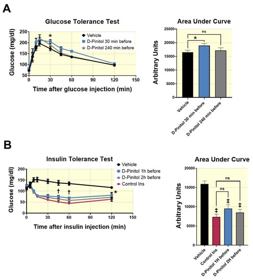 Changes in Wistar male rats blood glucose (mg/dl), during: (A) glucose tolerant test (GTT). Animals were fasted for 18 h before they received an i.p. injection of glucose (2 g/Kg i.p.) Blood glucose concentrations were measured in blood drawn from the tail vein using a glucometer (AccuCheck, Roche, Germany), at 0 (basal level), 5, 10, 15, 30, 45, 60 and 120 min after the glucose injection. The GTT was done at the end of 30 or 240 min of D-Pinitol (100 mg/Kg p.o.) administration. A control group (vehicle) received only glucose injection. The area under the curve (AUC) was calculated for each group. The values are means ± SEM, eight animals per group. Data were analyzed using two-way Anova + Fisher’s LSD test: * p < 0.05 D-Pinitol 30 min group vs. vehicle group, ns = not significant. (B) Insulin tolerance test (ITT). Animals were fasted for 18 h before they received an i.p. insulin injection (0.75 insulin units/Kg). Blood glucose concentrations were measured in blood drawn from the tail vein using a glucometer (AccuCheck, Roche, Germany) at 0 (basal level), 5, 10, 15, 30, 45, 60 and 120 min after the insulin injection. The ITT was done at the end of 1 or 2 h of D-Pinitol (100 mg/Kg p.o.) administration. Vehicle group received only a saline solution injection; Control Ins group received only insulin injection. The area under the curve (AUC) was calculated for each group. The values are means ± SEM, eight animals per group. Data were analyzed using two-way Anova + Fisher’s LSD test: * p < 0.05 D Pinitol 1h group vs. Control Ins group, † p < 0.01 D-Pinitol 1h group vs. Control Ins group, ‡ p < 0.001 vs. Vehicle group, ns = not significant.