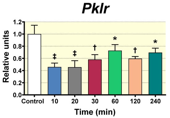 qPCR analysis of Pklr gene expression in liver tissue of Wistar male rats measured at different times (10, 20, 30, 60, 120 and 240 min) after D-Pinitol treatment (100 mg/Kg p.o.). The values are means ± SEM, 4–5 animals per group. Differences between groups were evaluated using one-way Anova + Fisher’s LSD test: * p < 0.05, † p < 0.01, ‡ p < 0.001 vs. Control group.