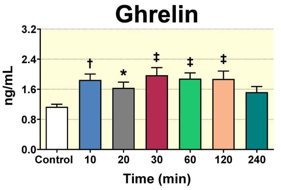 Effect of D-Pinitol (100 mg/Kg p.o.) on ghrelin levels (ng/mL) in plasma of Wistar male rats at 10, 20, 30, 60, 120 and 240 min after administration. Values measured using a commercial ELISA kit. The values are means ± SEM, 3–5 animals per group. Differences between groups were evaluated using one-way Anova + Fisher’s LSD test: * p < 0.05, † p < 0.01, ‡ p < 0.001 vs. Control group.