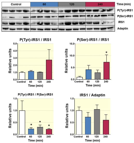 Western blot analysis of the phosphorylation status of the IRS1 from liver lysates of Wistar rats treated with 500 mg/Kg of D-Pinitol (p.o.) for 60, 120 and 240 min. Representative Western blot analysis for IRS1 (upper panels) and p(Tyr)-IRS1/IRS1 ratio, p(Ser)-IRS1/IRS1 ratio, p(Tyr)-IRS1/p(Ser)-IRS1 ratio and IRS1/adaptin ratio (bottom panels) from liver samples of Wistar rats treated with D-Pinitol for times indicated in figure. The blot shows analysis from four independent samples from each treatment group. The corresponding expression of adaptin is shown as a loading control per lane. All samples shown in the figure were derived at the same time, and processed in parallel in the corresponding blot. The adjustment to digital images did not alter the information contained therein. Differences between groups were evaluated using one-way Anova + Fisher’s LSD test: * p < 0.05 vs. Control group.